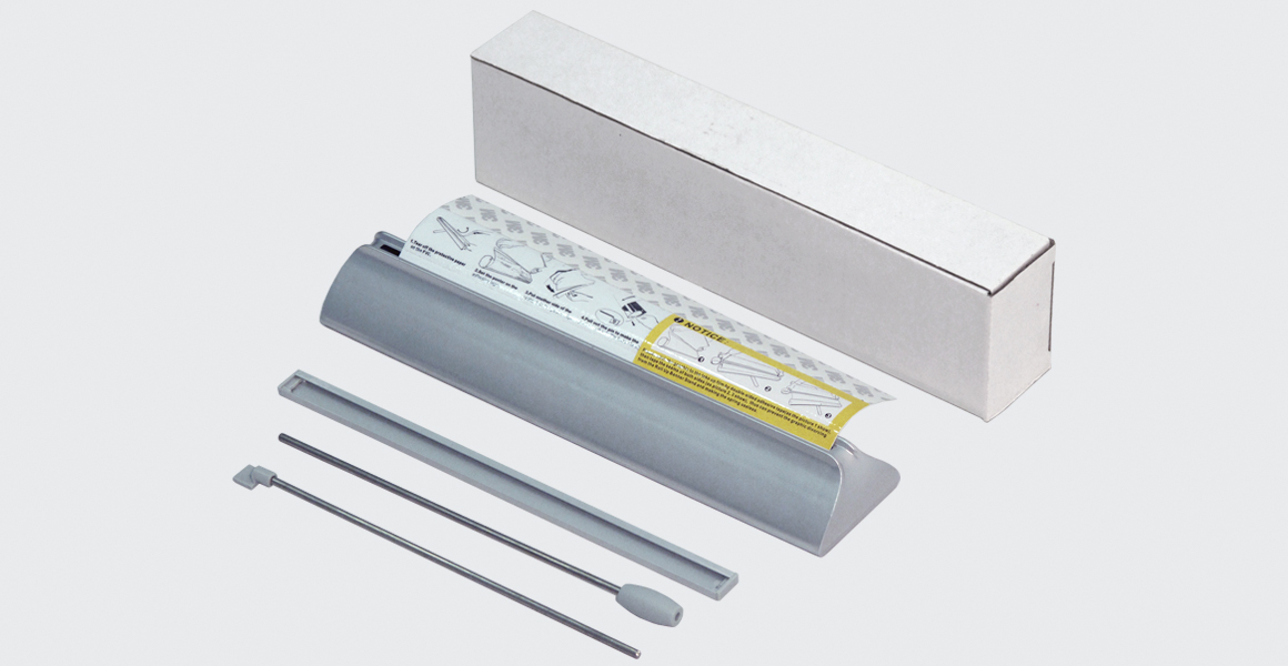 Expositor para aplicação em balcão, com enrolador manual e um mastro de alumínio. Método de fixação do poster por colagem no topo.